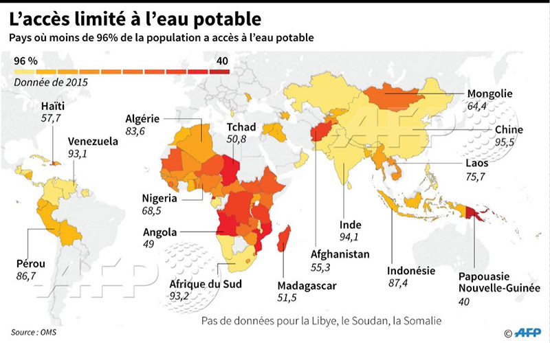 L’eau de notre planète bleue est donc majoritairement salée. 11 % de la population mondiale, soit environ 844 millions d’individus, n’avait pas d’accès à l’eau potable en 2015 selon un rapport de l’OMS et de l’Unicef (relatif au progrès en matière d’assainissement et d’alimentation en eau en 2017). L’eau potable n’est pas accessible pour tous au même niveau ce qui limite le développement de certaines régions du monde et favorise les conflits et les guerres.