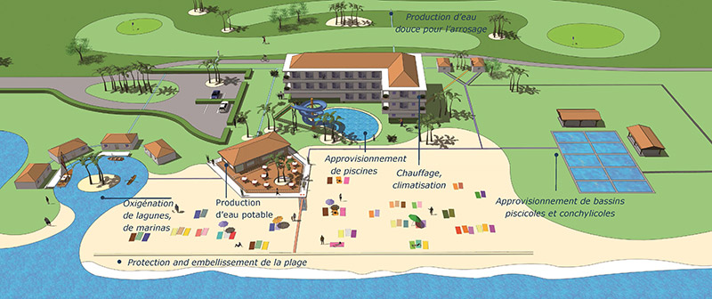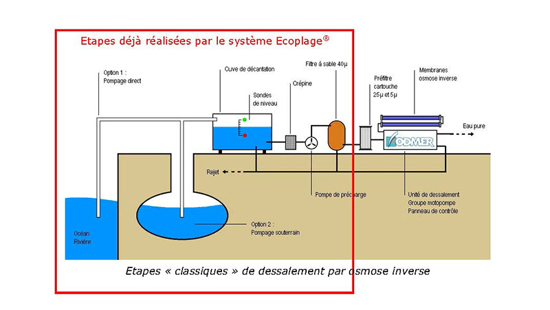 La capacité filtrante d’une plage permet, grâce au système Ecoplage, de recueillir une eau hautement filtrée où l’indice de colmatage et la turbidité sont sous les seuils requis par les fabricants d’osmoseurs. Cela permet de s’affranchir des étapes de filtration de l’eau de mer (décantation, filtres à sable, crépines…), coûteuses en énergie.