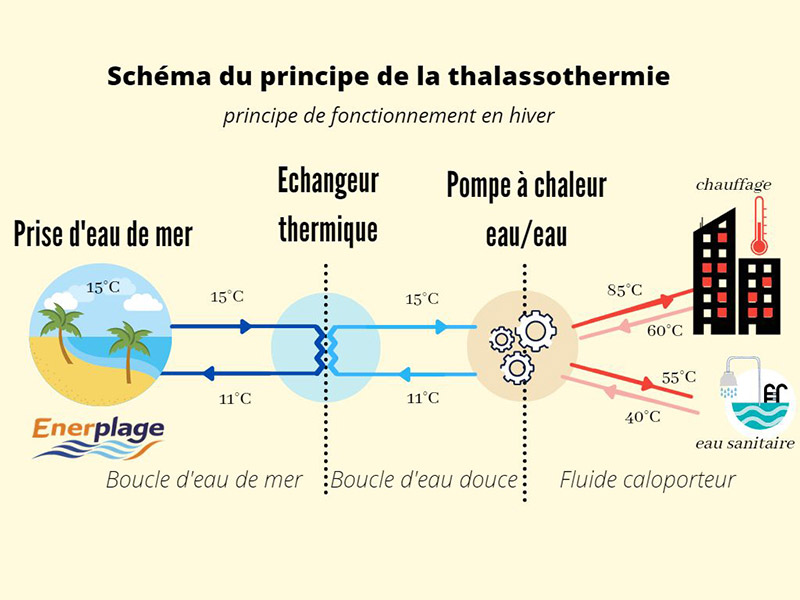 L’eau de mer est pompée et acheminée vers des échangeurs thermiques où des calories sont transportées vers un réseau d’eau douce. L’eau de mer est ensuite restituée dans son milieu naturel avec quelques degrés en moins ou en plus, le volume d’eau de mer utilisé se dilue vite et ne compromet pas la biodiversité. La boucle d’eau douce transporte les calories jusqu’aux pompes à chaleur eau/eau, ces pompes convertissent ces calories en chaud et/ou froid en fonction des besoins des infrastructures.