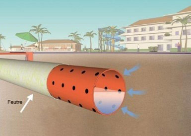 • Un ou plusieurs drains : installés parallèlement au trait de côte, ils permettent à l’eau de la vague de s’infiltrer par dépression, assurant ainsi une désaturation du sable et permettant ainsi une bonne captation des sédiments sur le haut de plage