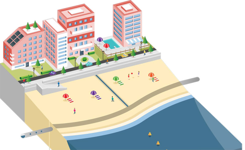 Le procédé crée un profil d’équilibre de plage stable, sans impact sur les zones littorales adjacentes. Il ne déplace pas le problème d’érosion.