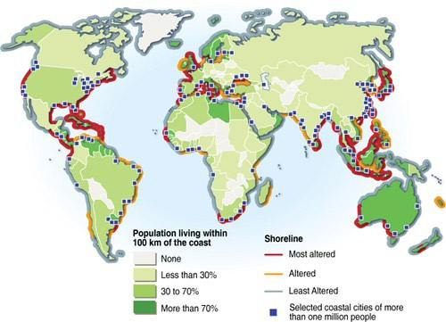 Aujourd’hui, 60% de la population mondiale vit dans la grande zone côtière (UICN) et la montée des océans et l’érosion vont faire disparaître de nombreuses plages et rendre certaines zones inhabitables. 70% des plages du monde sont en phase d’érosion plus ou moins rapide. L’érosion du littoral peut également s’avérer dangereuse car cela peut entraîner l’érosion des falaises. De même, les submersions marines peuvent être létales pour l’Homme lorsqu’elles interviennent au cours de catastrophes naturelles.